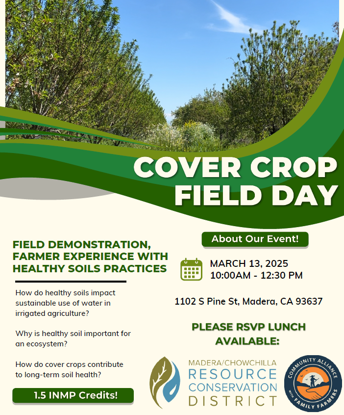 Due to the weather forecast, we are moving our cover crop workshop event indoors. It will now be at the Madera County Farm Bureau located at 1102 S Pine St, Madera, CA 93637. 1.5 INMP credits are available to participants, and lunch will also be provided to participants during the event. We’re looking forward to seeing you ! You can register at the event using the link below: